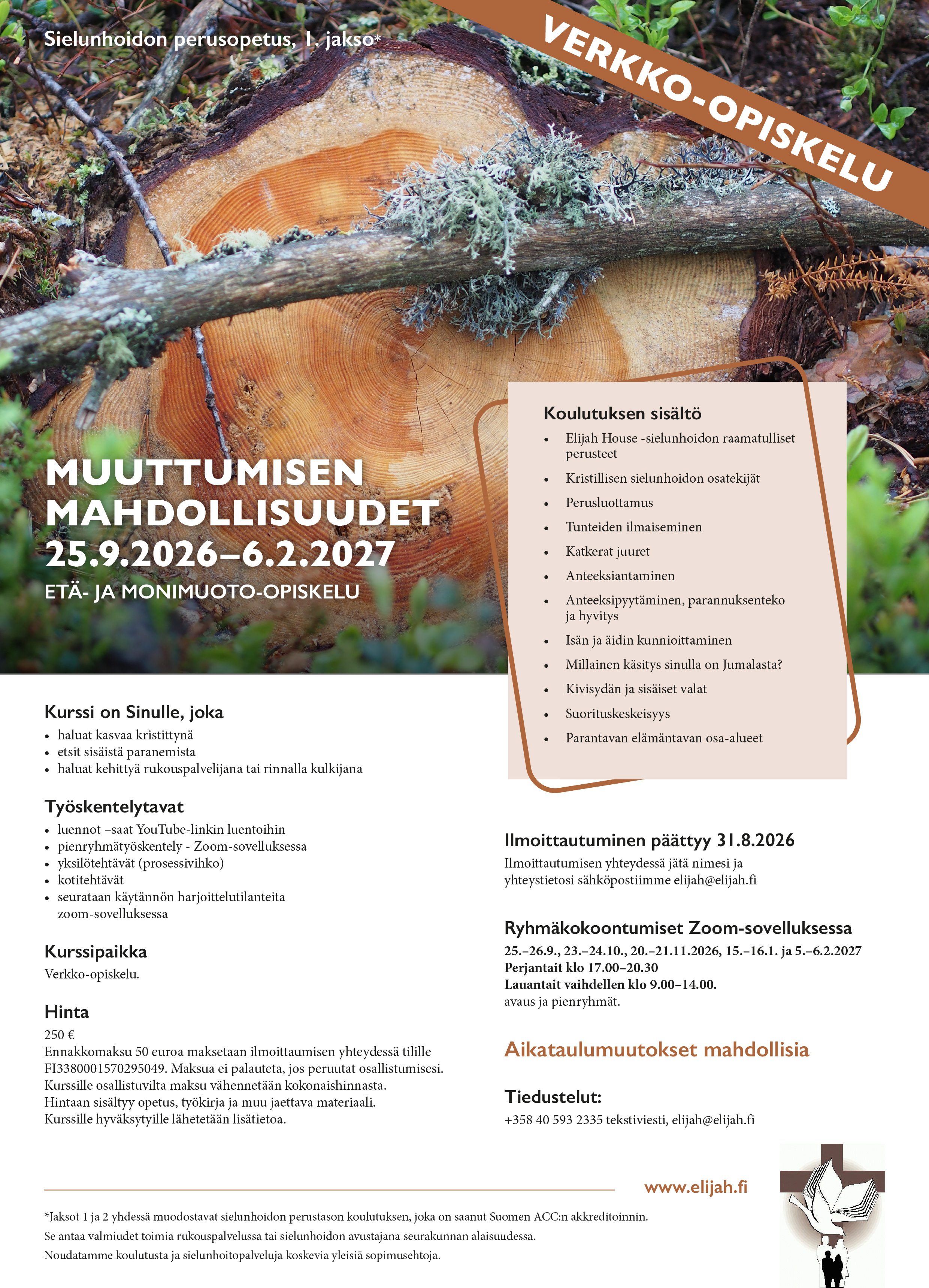 - olet suorittanut sielunhoidon perusopetuksen Muuttumisen mahdollisuudet ja Muuttumisen esteiden ylittäminen jaksot
